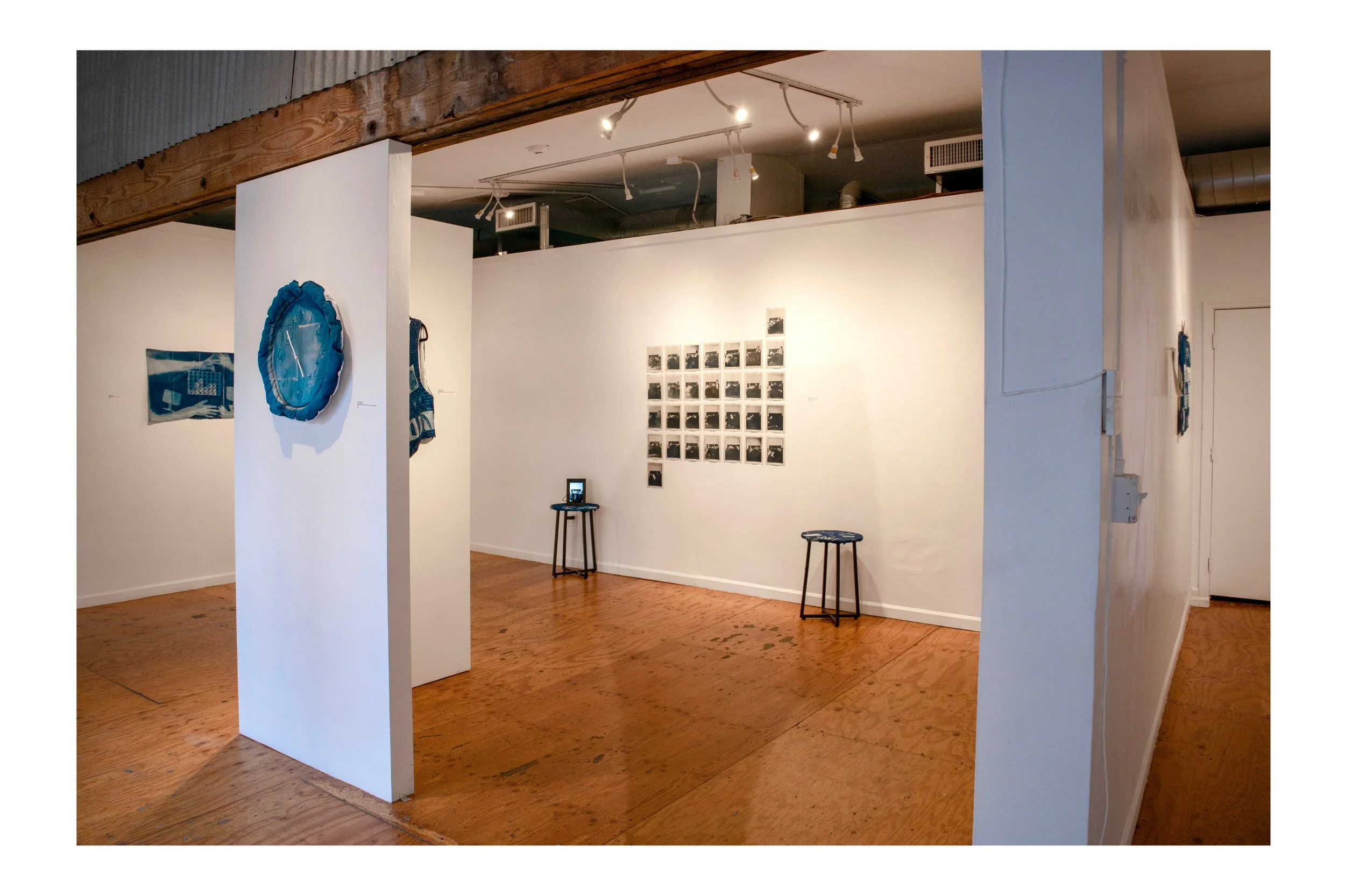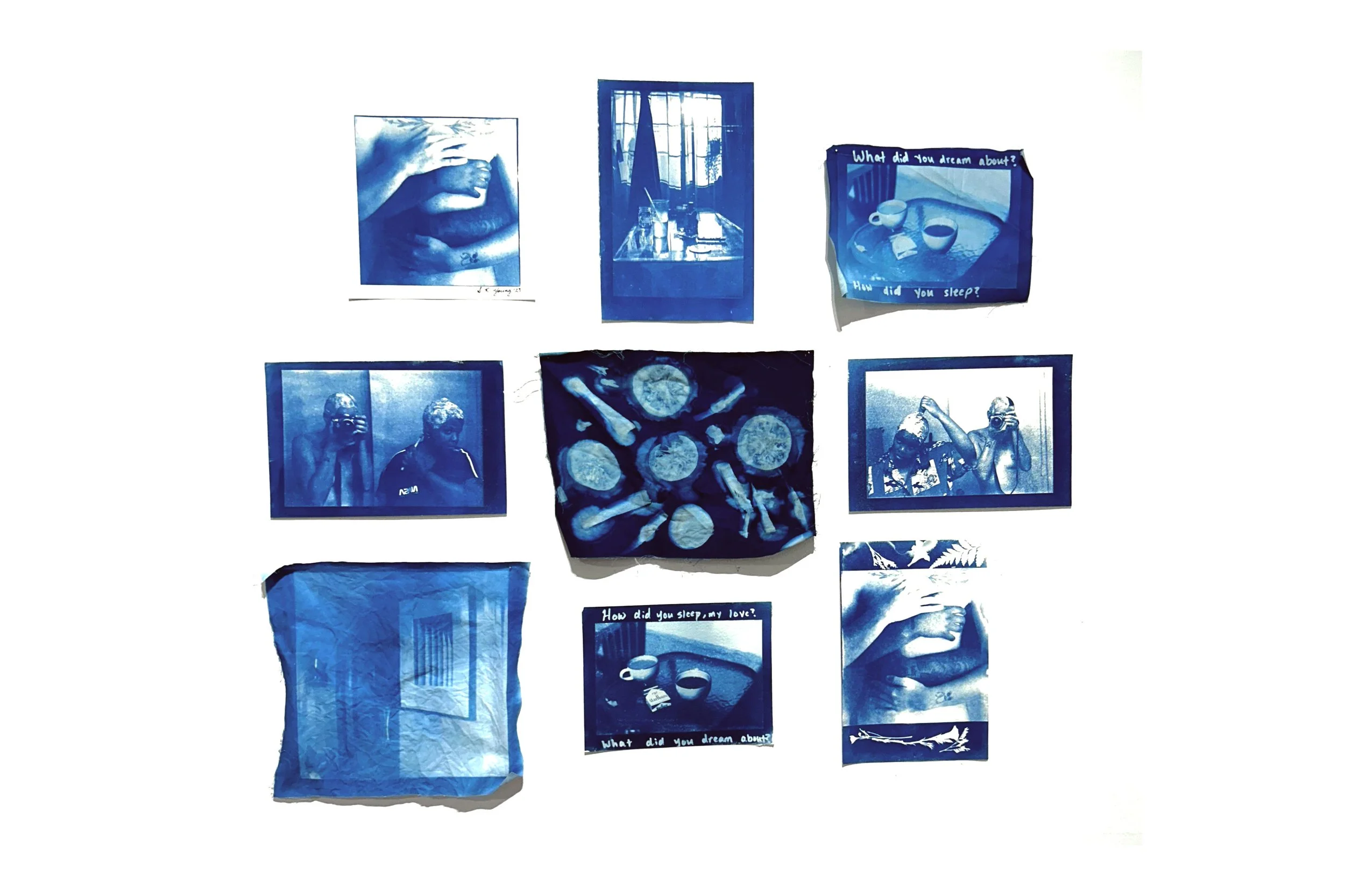 “The experience of home has been a consistent theme within Young's work-whether it was living with parents, an apartment on their own, or now living with their partner and four pets. While it has become a safe haven to explore their identity and freely express their emotions, there were times when they struggled to feel worthy of taking up space. In this new body of experimental cyanotype work, Young shows an intimate but playful look into their home life both past and present. They reflect on writings and drawings made when they were younger, to the simplicities of waking up next to someone they love. As a self described home body, Young is taking a look at how these various environments shift the way we see ourselves.”